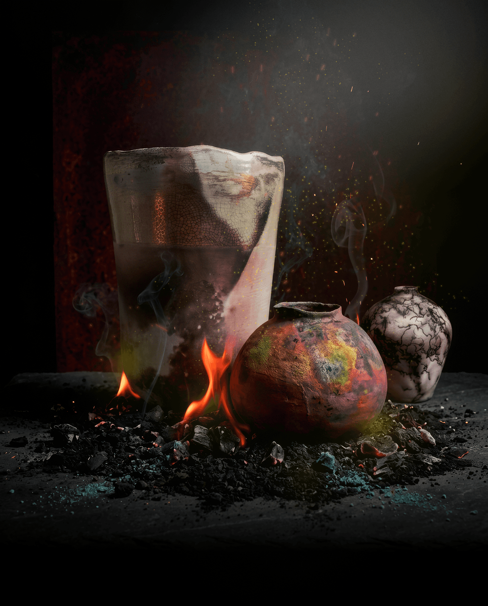 Materials used: copper-based raku glazes and reduction materials.